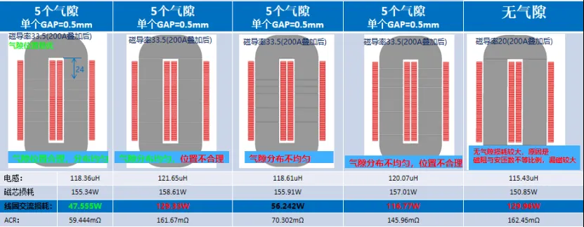 在设计中,重点研究了气隙的布置对损耗的影响。具体而言,分别对一个气隙、两个气隙、三个气隙、四个气隙和五个气隙的情况进行了分析,主要关注磁芯损耗、线圈损耗以及ACR(交流电阻)。