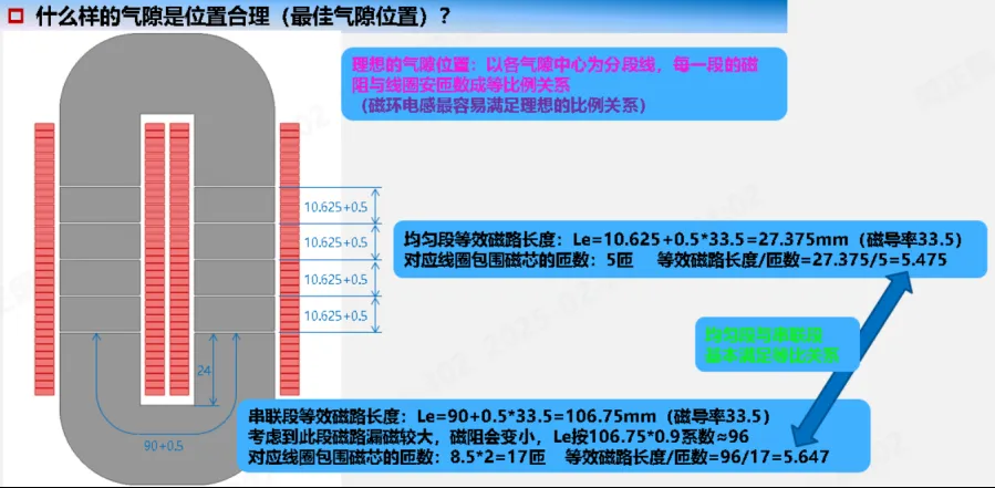 理想的气隙位置是以各气隙中心为分段线,每一段的磁阻与线圈安匝数成比例关系,而磁环电感最容易满足这种理想的比例关系。