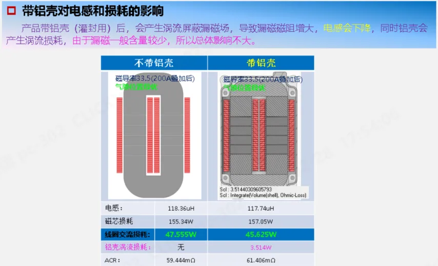 也就是说产品带铝壳(灌封用)后,会产生涡流屏蔽漏磁场,导致漏磁磁阻增大,电感会下降,同时铝壳会产生涡流损耗,由于漏磁一般含量较少,所以总体影响不大。