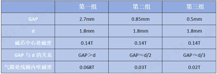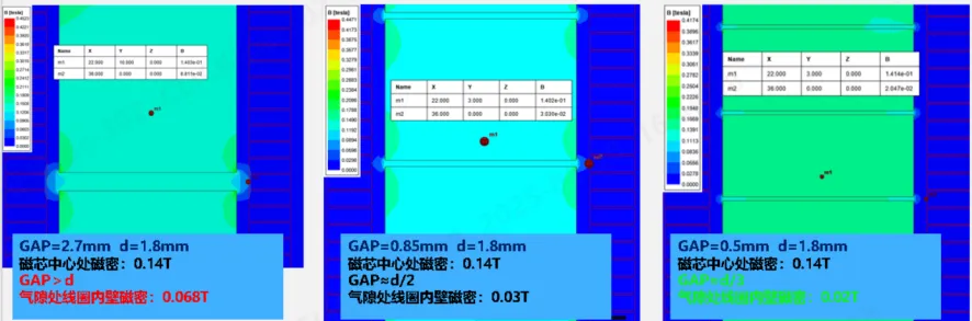 下面是相同的线圈到磁芯的间距d=1.8mm,研究GAP的大小仿真结果案例: