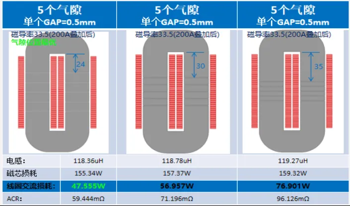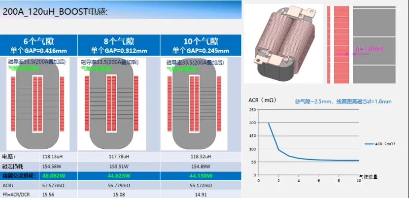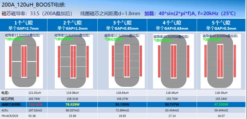 本文分享200A 升压电感为例,分析不同的气隙方案对电感线圈损耗的影响:
