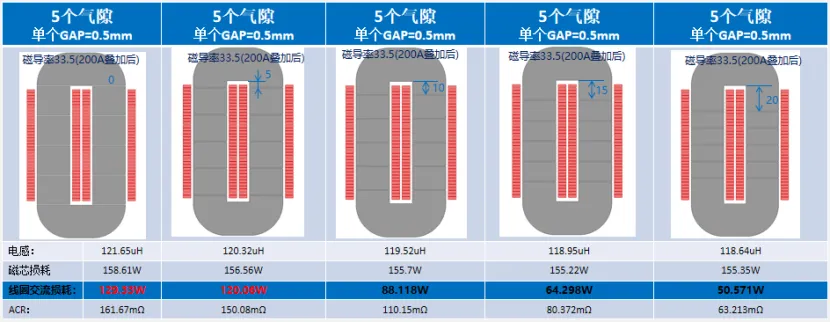 随后,可立克团队开展了更为深入的分段研究。当分别将气隙设置为 6 个、8 个、10 个时,交流损耗并未出现显著降低。由此可以得出结论:就生产需求及成本控制而言,设置 5 个气隙即可满足要求。