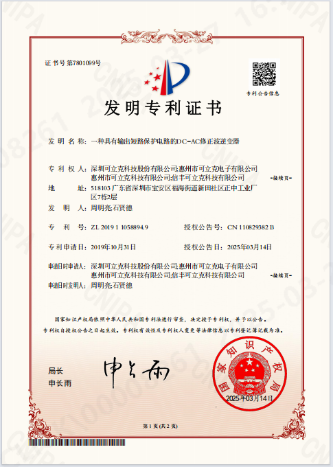 可立克凭借自主创新取得的关于电源"具有输出短路保护电路的DC-AC修正波逆变器"发明专利,为这一技术瓶颈提供了突破性解决方案。