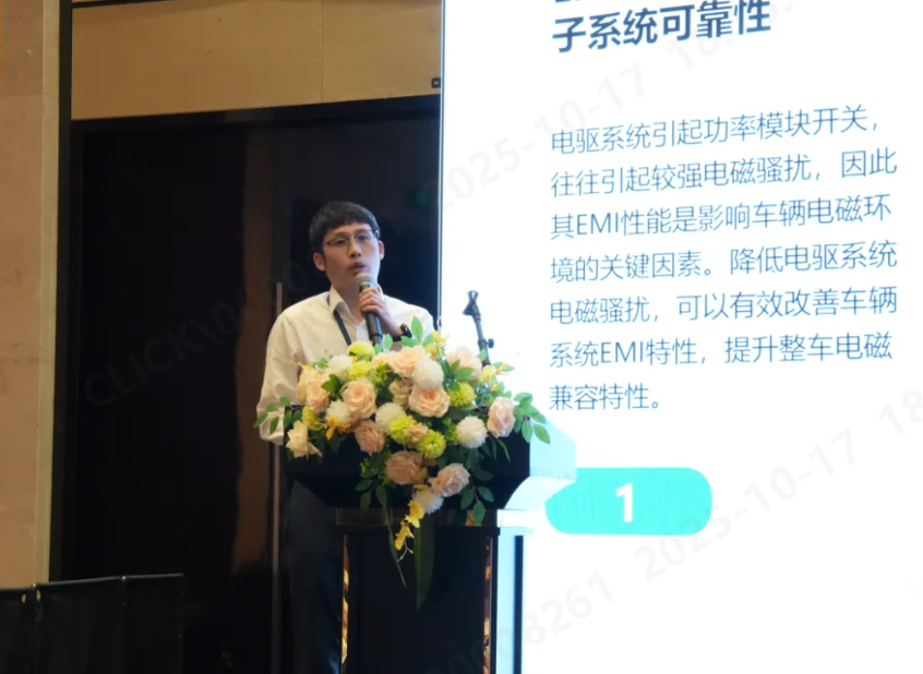 郭军朝以《电驱系统传导和辐射发射仿真技术研究与应用》为题发表演讲,电驱系统是新能源汽车上的重要的电磁干扰源,电驱系统的高速化、轻量化、多合一集成化给系统的传导发射、辐射发射带来了严峻的挑战。在传导发射、辐射发射整改降噪过程中,磁性器件的特性起着重要的作用,例如需要深度理解无源器件共模电感、差模电感、磁珠等的电磁特性。