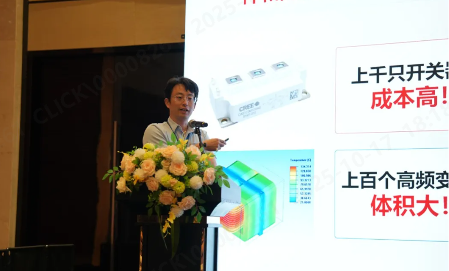 崔彬以《大容量固态变压器关键技术研究》为题发表演讲,固态变压器是一种含有电力电子变换器和高频隔离变压器,实现电压变换、功率传输和电气隔离的变电装置,具有功率密度高、体积小、重量低、噪声小、控制灵活及电气隔离等诸多优点,并介绍了其在直流变压器、中高频隔离变压器、数据中心、新能源和储能上的应用和关键技术。